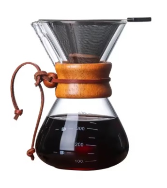 Una tetera de café de vidrio manual con filtro de acero inoxidable, también conocida como cafetera de goteo o «pour over», es un método de preparación de café que permite un control total sobre el proceso. Se caracteriza por su diseño simple y el uso de materiales de alta calidad, que buscan resaltar las propiedades del café molido.